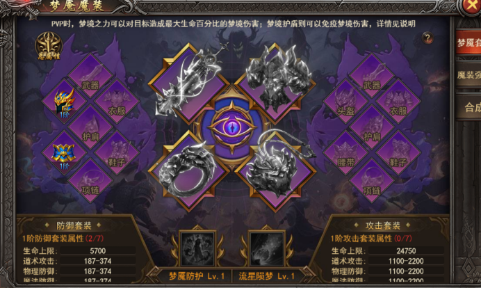 a. 防御/攻击套装:专属技能--梦魇防护:穿戴1阶14件蚀魂和血灾套装激活,被攻击时有一定概率触发,一定时间内,加成一定梦境之力,梦境抵抗,冷却一定时间;